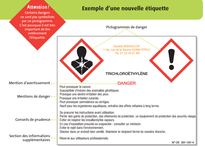 C’est à partir de cette classification qu’est définie l’étiquette du produit sur laquelle figurent les informations essentielles sur les dangers et les précautions à prendre pour l’utilisation et le stockage de tel ou tel produit chimique dangereux :